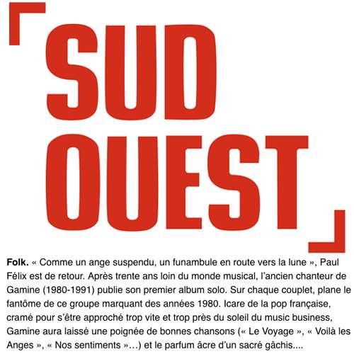 Chronique de l'album chez le Quotidien Sud Ouest. [...] Le chanteur bordelais publie onze chansons en solo, et réveille le sourire tendre du groupe Gamine dont il était la figure de proue. [...]